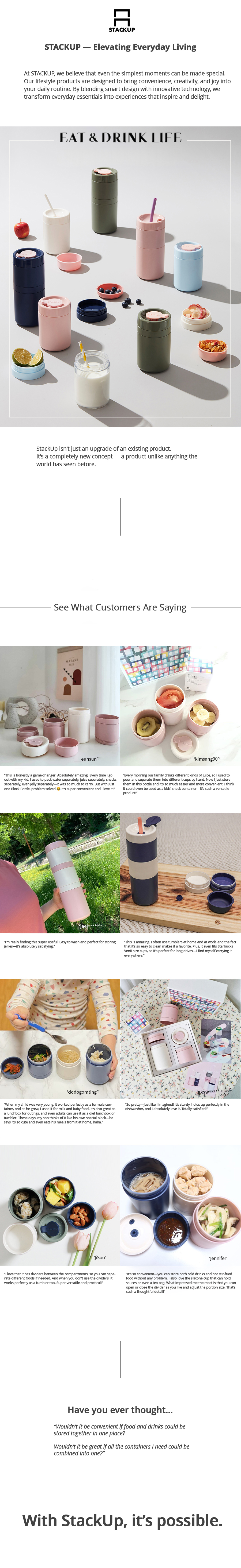 - Good Innovation: The STACKUP tumbler is a unique and innovative solution for anyone who wants a personalized and versatile container for their drinks and snacks. Its modular design and durable construction make it a great choice for anyone who values convenience, organization, and sustainability.