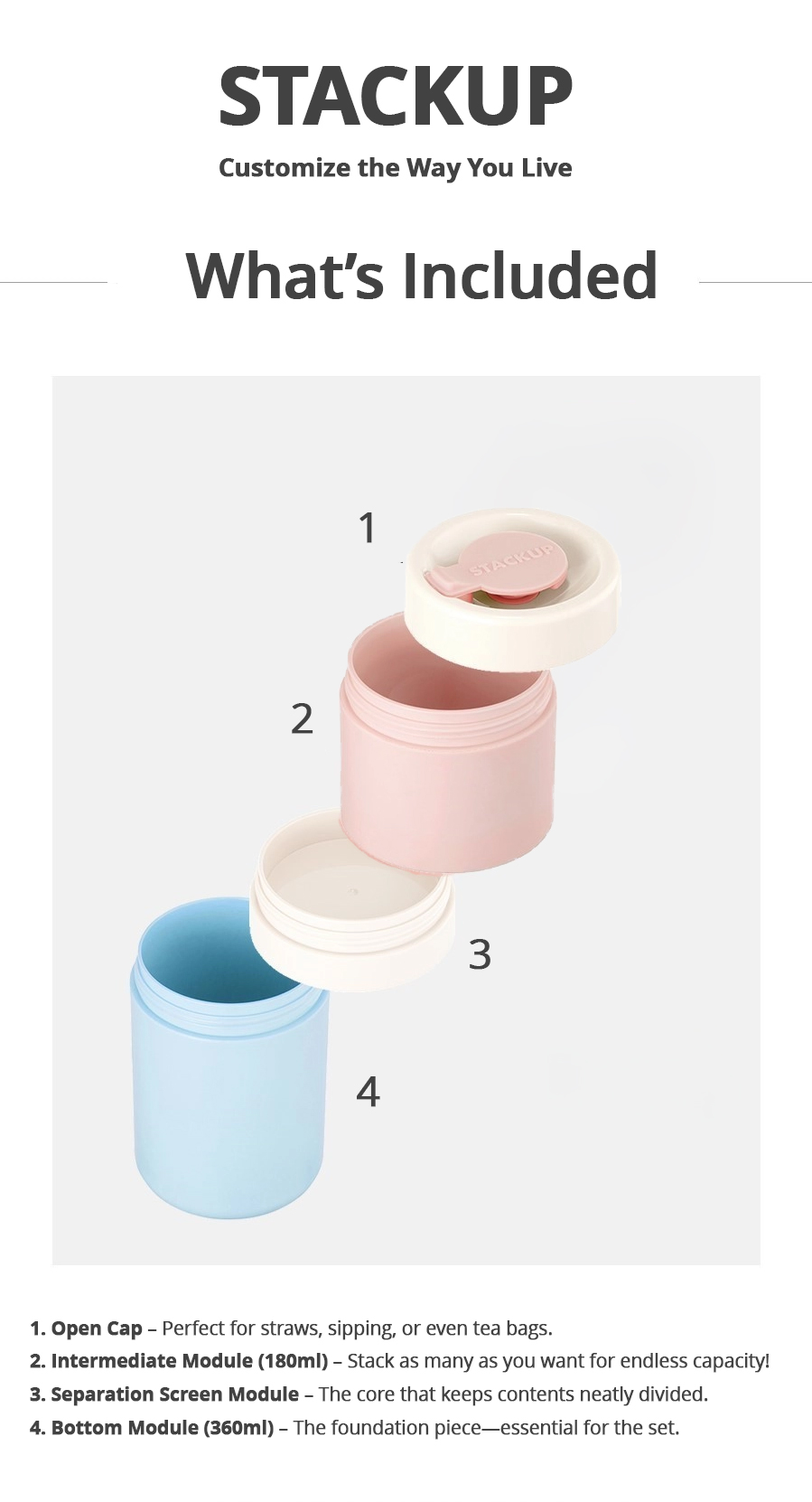- Easy-to-clean modular design: The modular design of the STACKUP tumbler allows for easy cleaning and maintenance. The individual modules can be separated and washed separately, making it simpler to keep the container clean and hygienic.