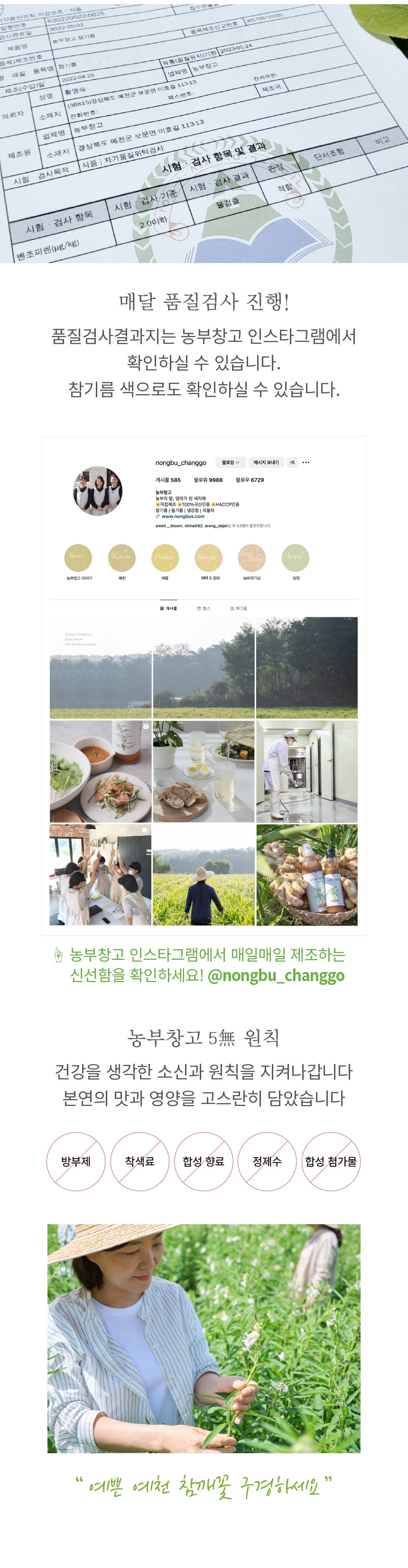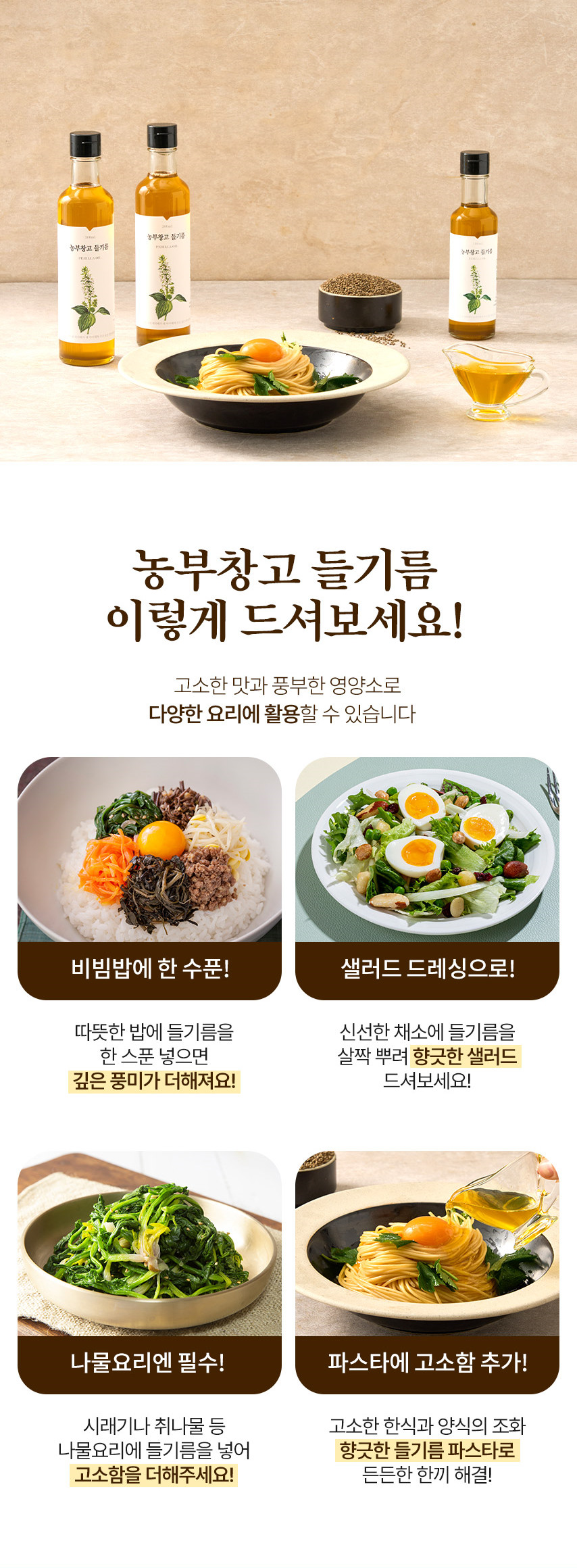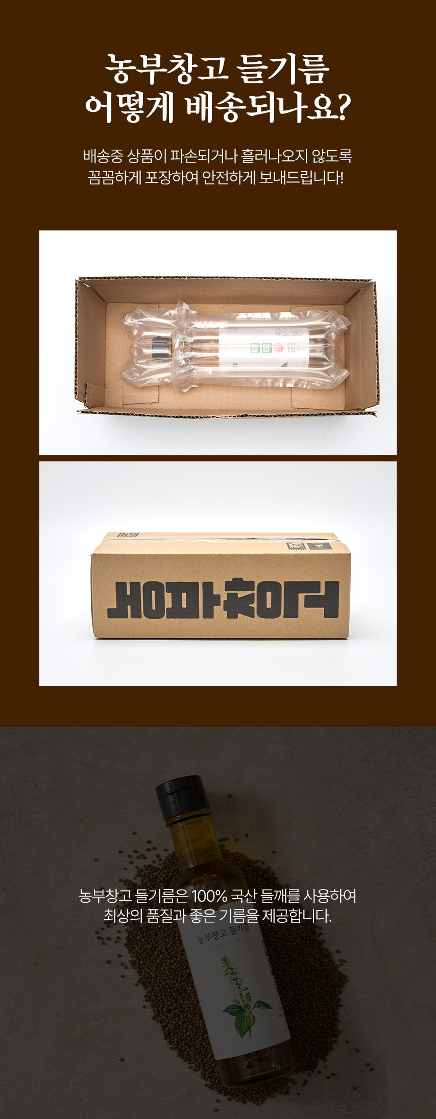국산 참깨·들깨만을 사용해 오일을 만듭니다. 지역 농가와의 계약재배를 통해 원물을 수급하고, 향을 내기 위한 고온 착유가 아닌 저온 로스팅·저온 압착 방식으로 참깨 본연의 맛과 영양을 지켜냅니다.