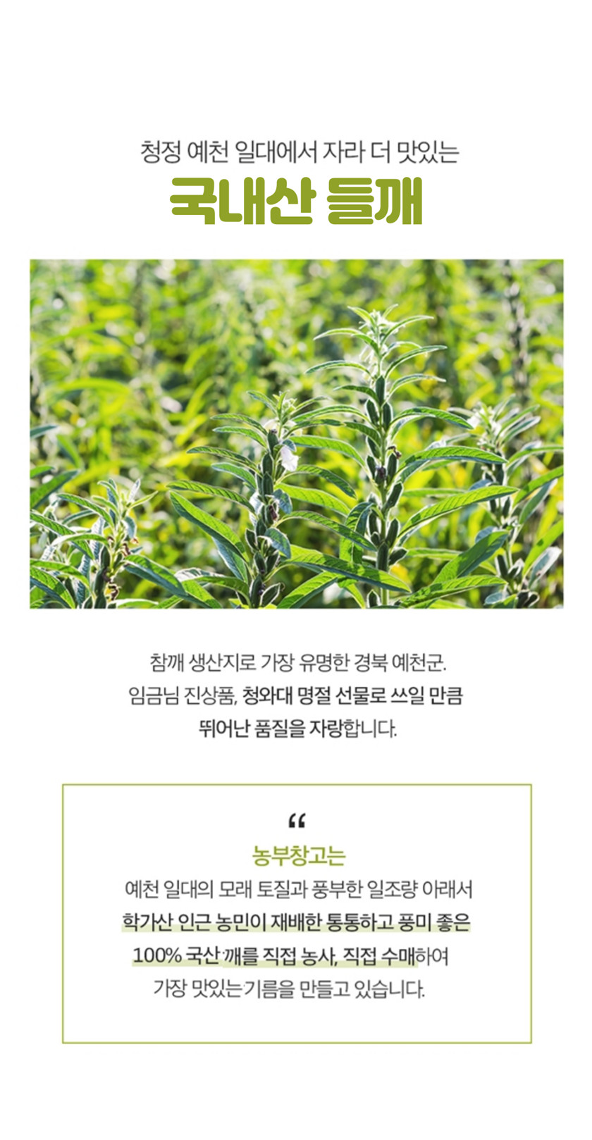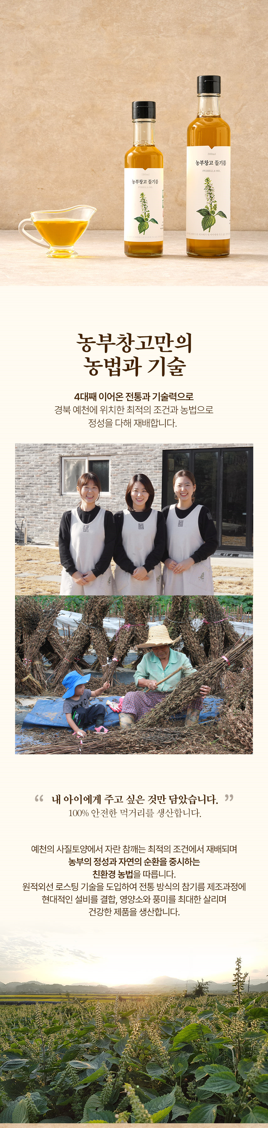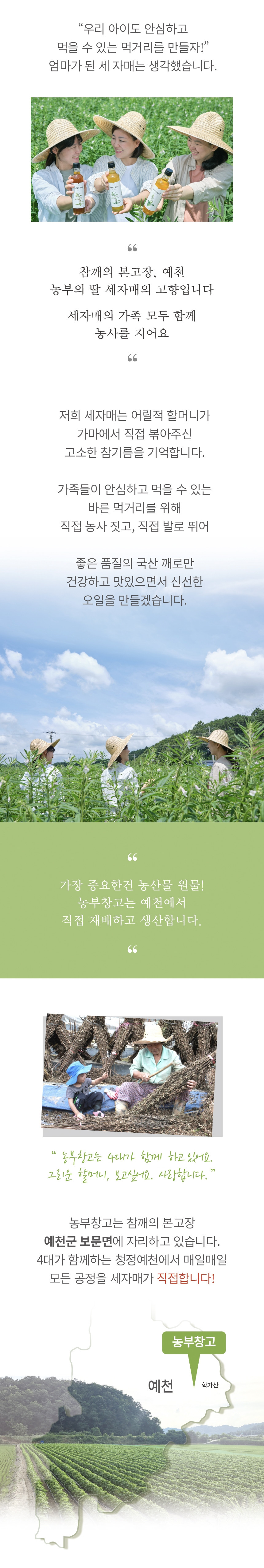 세 자매가 직접 운영하는 100% 국산 저온압착 참기름·들기름 브랜드입니다.