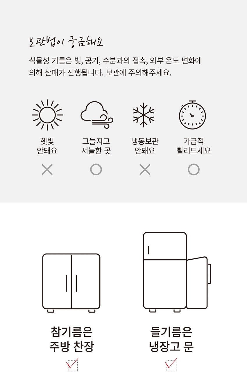 색·향·첨가물을 더하지 않은 자연 그대로의 오일, 대량 생산보다 원재료와 공정의 정직함을 먼저 생각합니다.