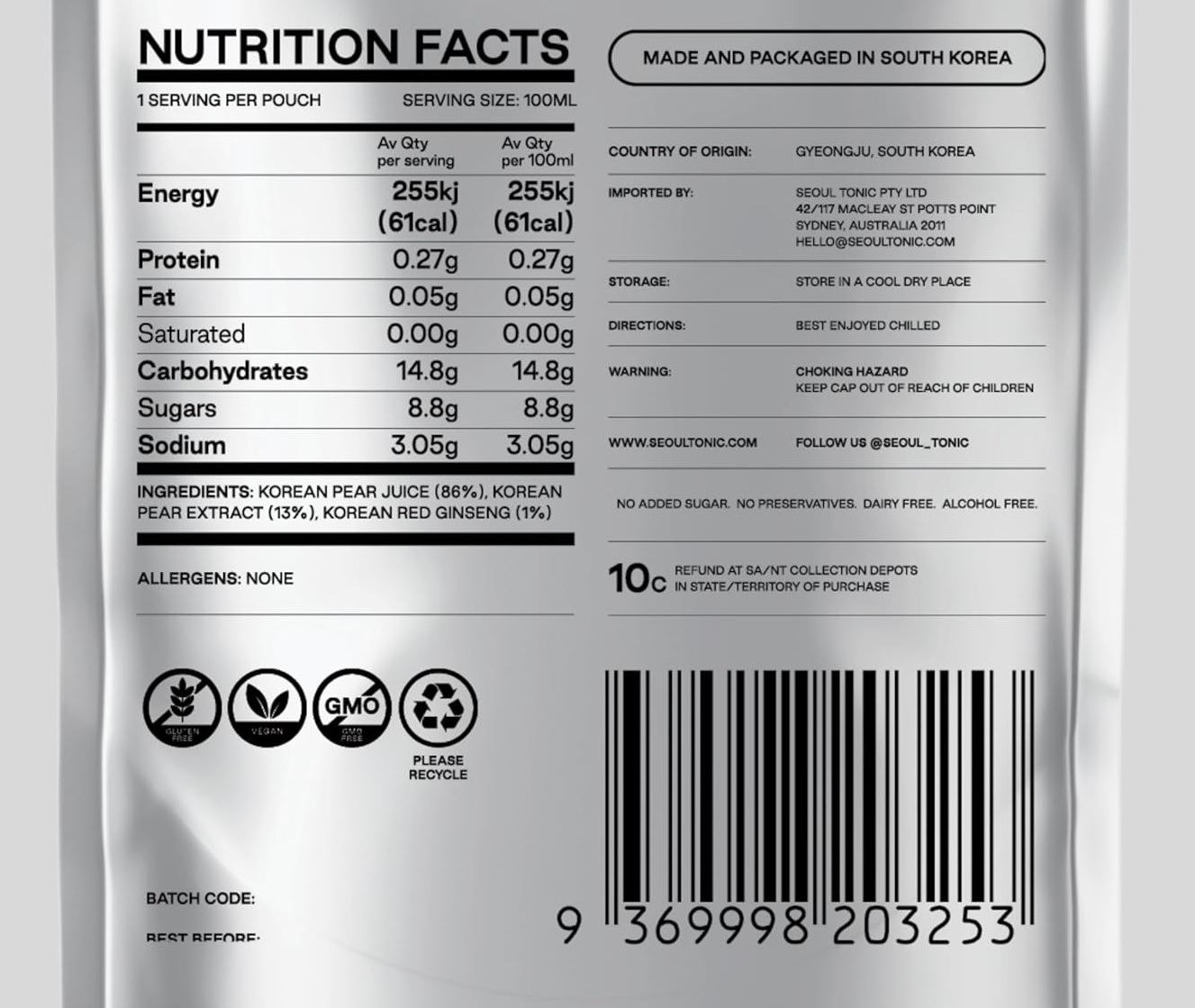 서울토닉은 국내산 배와 헛개나무 열매 추출물을 배합해